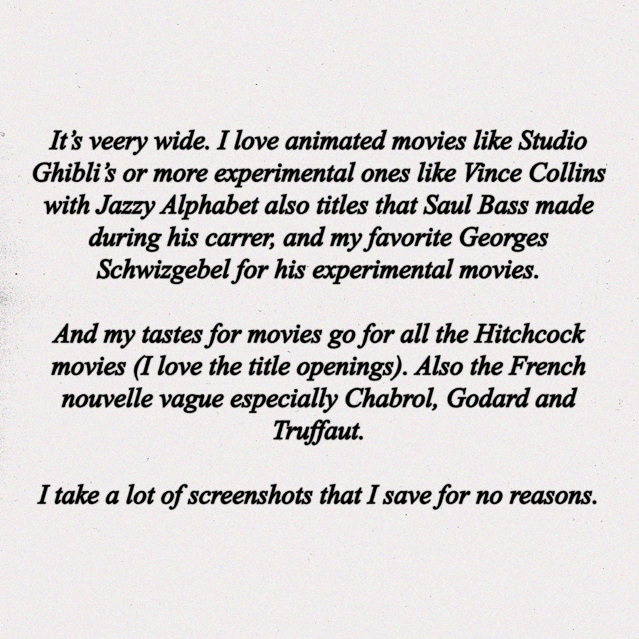 Now that I have received the answers from Alexis, I wanted to finish the interview video by animating his responses. Because his answers were pretty long, I think it would work best if the animations behind the frames were fairly simple so they don't distract from the actual text. Due to this, I decided to stick to a blurred effect with somewhat abstract shapes; this still links to his style, as a lot of his work deals with simple shapes and fluid blurred motions.